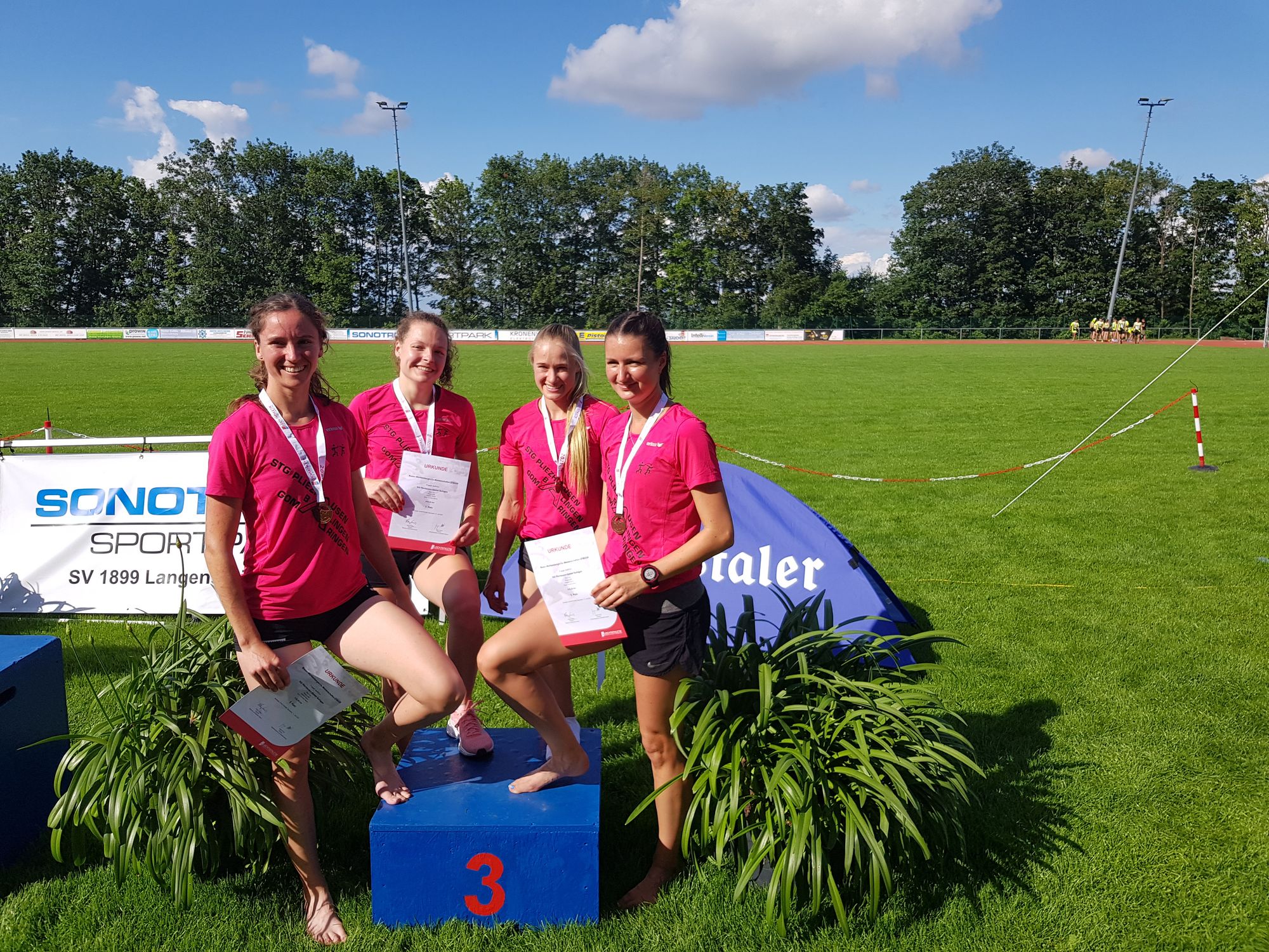 Die Aktiven trugen im Rahmen dieser Meisterschaften die 4x400m-Staffelwettbewerbe aus. Mit dabei in bewährter Besetzung: Die Startgemeinschaft Pliezhausen-Gomaringen-Balingen. Kim Penz von der TSG Balingen brachte das Team als Startläuferin mit einer schnellen 57 Sekunden-Runde in Führung. Die währte nur kurz, denn die MTG Mannheim und der favorisierte USC Freiburg hatten auf den Positionen zwei und drei sehr schnelle Läuferinnen platziert. Dennoch hielten Julia Rieger und Kathrin Wallner den Anschluss und übergaben das Staffelholz an 3. Stelle liegend an Schlussläuferin Caro Sauer. Diese kam mit einer 54-Sekunden-Runde nochmals ganz nach an Mannheim heran, änderte aber die Reihenfolge nicht mehr. Es gewann der USC Freiburg in 3:44,29 min vor der MTG Mannheim (3:50,34) und der Startgemeinschaft in 3:52,28min. Die anderen Zeitläufe kamen die Leistung nicht heran und so durfte sich das Team über die Bronzemedaille freuen.