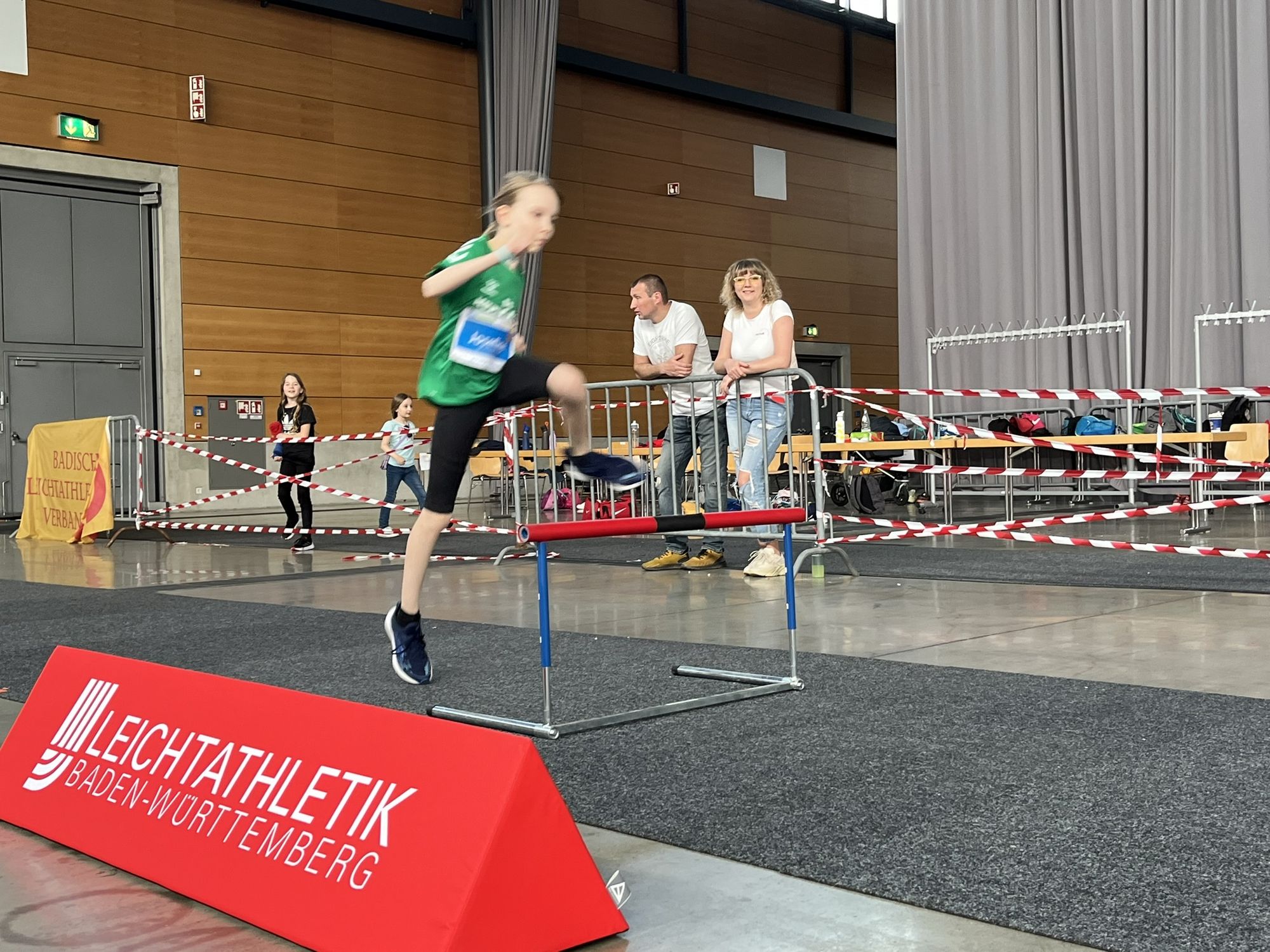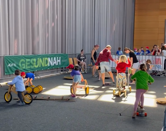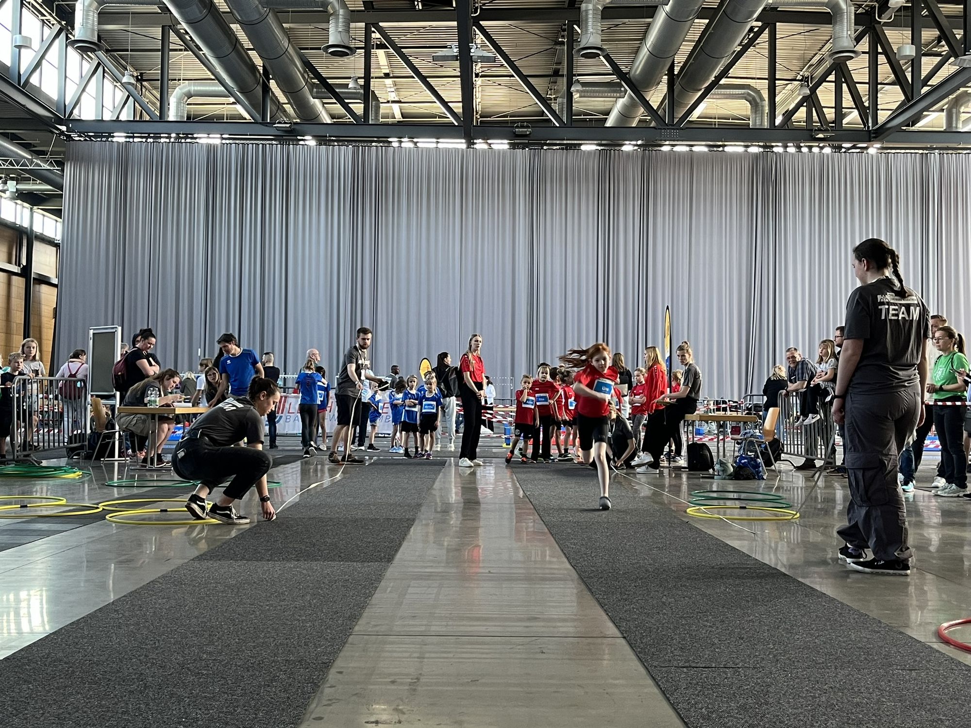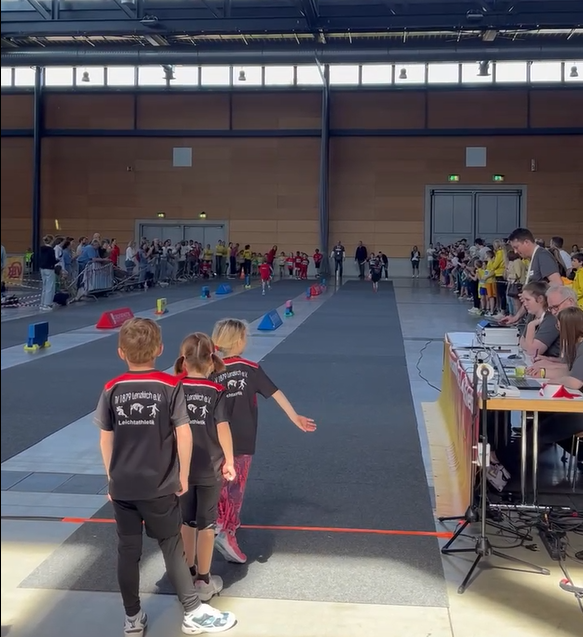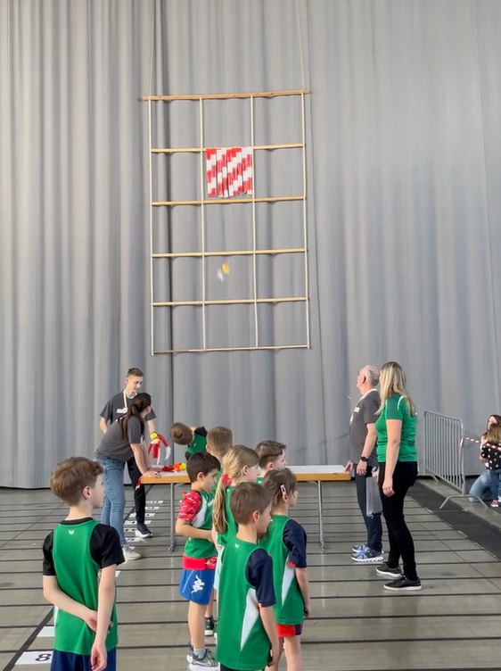 Wer nicht zu einem Team der U8, U10 oder U12 gehörte, aber trotzdem mal wissen wollte, wie Kinderleichtathletik funktioniert, hatte am Sonntag die Gelegenheit dazu. Dafür wurden die Stationen für alle Besucher:innen geöffnet. Unter dem Motto ‚Laufen, Springen & Werfen – Kinder(leicht) bewegt‘ konnten die Kinder mit einem Laufzettel von Station zu Station gehen und fleißig Stempel sammeln. Ein kleines Geschenk gab es dann, wenn man fünf von sechs Stationen absolviert und damit genügend Stempel gesammelt hatte. Die ganz Motivierten durften natürlich auch eine zweite Runde drehen und der eine oder andere Elternteil wurde von der Energie der Kinder überzeugt, sich mit dem eigenen Kind zu duellieren.