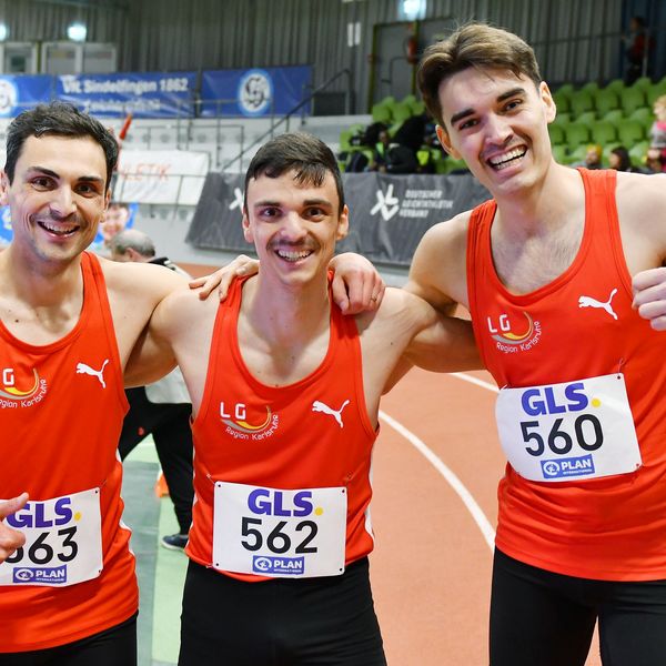 Der Schlussläufer der Karlsruher 3x1.000 Meter-Staffel, Lorenz Herrmann, reckte im Ziel die Faust: Er holte gemeinsam mit seinen Team-Kollegen, den beiden Kessler-Brüdern Alexander und Christoph, Gold in 7:20,17 Minuten. Auf heimischer Bahn lief das Sindelfinger Trio mit Henri Stöckermann, Kurt Lauer, und Johannes Hein in 7:23,84 Minuten auf den Bronze-Rang, Vierter wurde die LG farbtex Nordschwarzwald mit Henri Hansert, Karl Löbe, und Jens Mergenthaler (7:25,09 min).