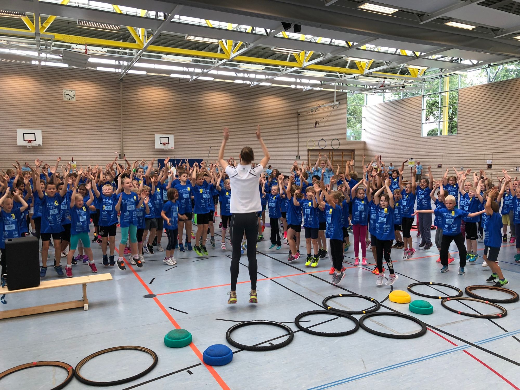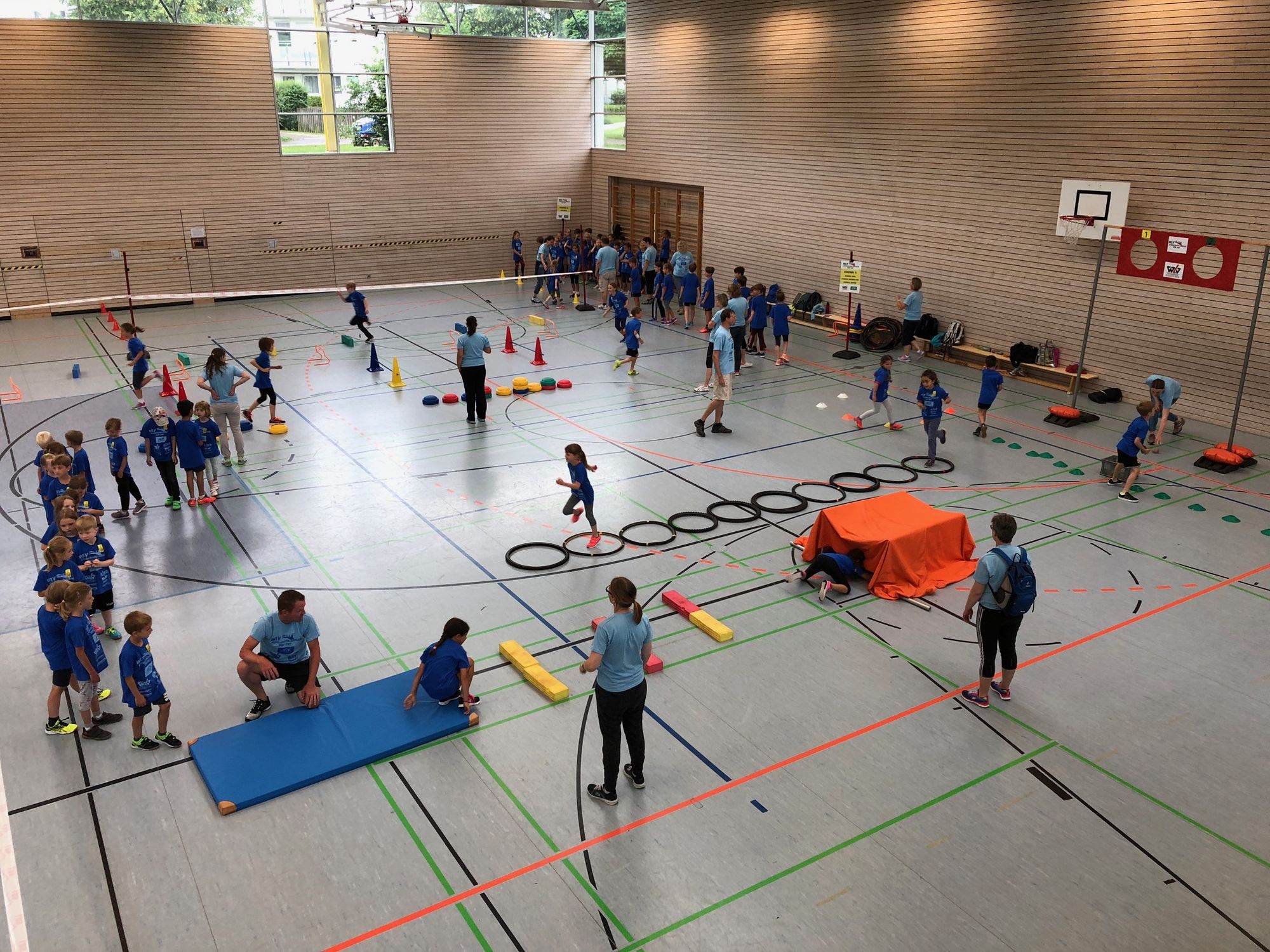 Nach dem optimistischen Aufbau draußen entschied sich das WLV-Team aufgrund von stärker werdendem Regen doch dazu, alle acht Stationen in die Drei-Felder-Halle der Grundschule zu verlegen. Mithilfe der vielen Helfer war der Umzug schnell geschafft, sodass alles bereitstand, als die 200 Kinder der Adolf-Rehn-Schule ankamen.