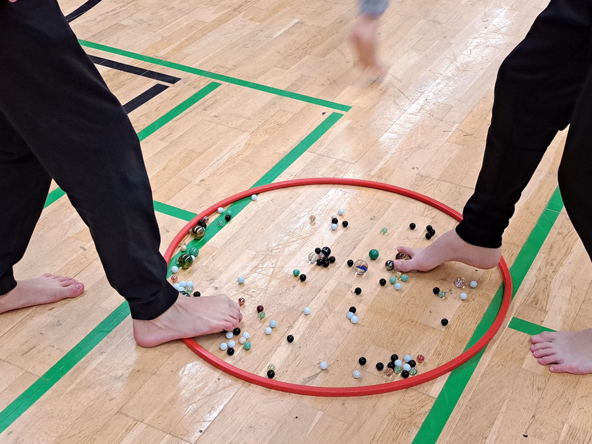 Der richtige Fußaufsatz, um sprinten, abspringen oder richtig drehen zu können, war immer wieder das Thema für die 27 jungen Talente, die von Regina und Christoph Geissler, Luca Mazzei, David Wrobel und Christian Hummel betreut wurden. Und dann musste man ja frühmorgens noch durch den leicht vereisten Rasen rund um die Sportschule marschieren, um danach mit gut durchbluteten Füßen Gymnastik zu betreiben oder Murmeln zu transportieren …
