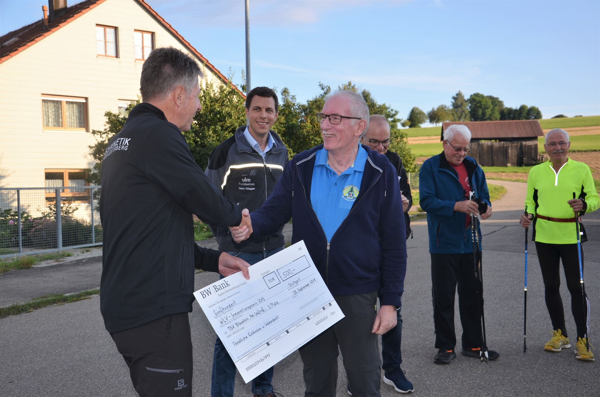Das Projekt wurde nun vom Württ. Leichtathletik Verband mit dem 3. Preis der Innovationsprämie 2019 ausgezeichnet. Im Rahmen des Lauftreffs am Montag Abend in Blaustein überreichte Gerhard Lang vom WLV-Fachausschuss Freizeit-, Lauf-, Gesundheitssport einen Scheck, über den sich neben dem Abteilungsleiter Lauftreff, Hans-Jürgen Lang, auch der Förster Tobias Glöggler vom Revier Ulm-Nord sowie 43 Läufer und Walker des TSV Blaustein freuten.