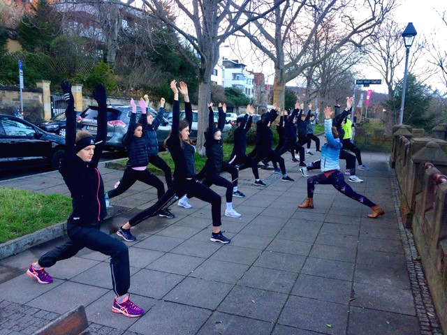 Neben allgemeinen Kräftigungsübungen, Hürden- und Laufschulung gehörten auch verschiedenen Meditations- und Yogaeinheiten zum sportlichen Teil des Lehrgangs. So genossen alle Trainer und Athleten gemeinsam unter Anleitung von Colette den Ausklang des ersten Lehrgangstages beim "entspannenden Yoga", um schon am nächsten Tag vor dem Frühstück den neuen Tag unter dem Motto: "positive Einstimmung auf den Tag, Standfestigkeit und Stabilität" über den Dächern der Stadt Stuttgart zu beginnen.