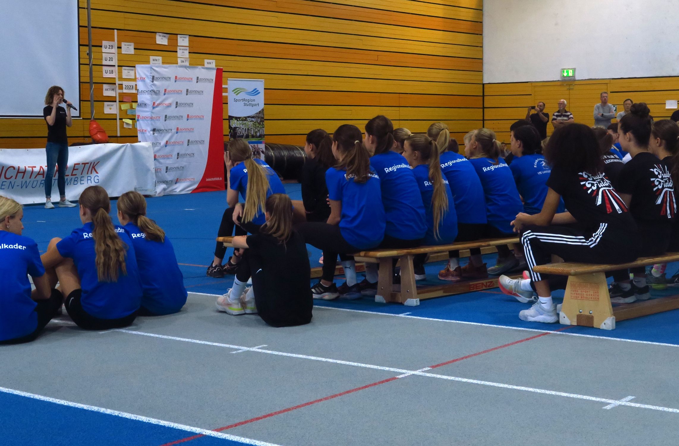 86 Jugendliche aus den württembergischen Vereine nutzten die Chance, das Trainingsumfeld des Bundesstützpunktes Stuttgart kennen zu lernen und sich vielleicht für die Sichtung zum Talentkader im November empfehlen zu können. Erste Begegnungen mit dem Spitzensport gab es schon beim Aufwärmen: Nach der Begrüßung durch Landestrainerin Jennifer Hartmann übernahm U20-Vize-Europameisterin Johanna Göring zusammen mit Ogechi Nathan das Kommando und sorgte dafür, dass die Jugendlichen gut vorbereitet in ihren Test-Sechskampf ziehen konnten. Das WLV-Talentsportfest wurde mit Unterstützung der SportRegion Stuttgart durchgeführt.
